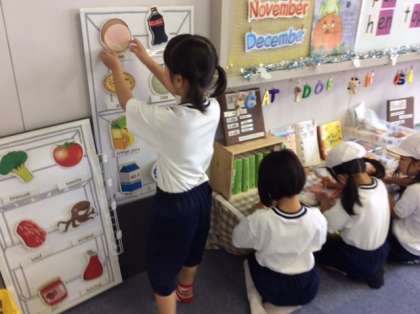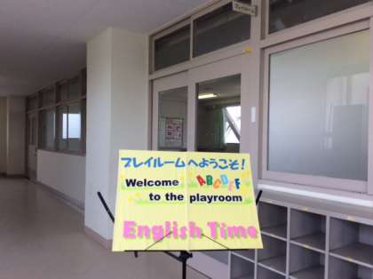 プレイルームで英語の音楽を聞きながら、英語の教具やゲームを体験したり、絵本を読んだりする時間「English Time」を設定しています。「English Time」がある日は、看板が出ているので、参加したい子どもたちは看板を目印にプレイルームに集まります。「Hello!」プレイルームに入ってくる子どもたちの元気なあいさつが学校に響きます。