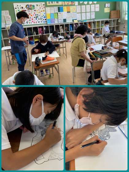 4年生は図工の学習で、自分が履いてきているくつを描きました。毎日、お世話になっているくつへ感謝の思いをもちながら、かかとの凹凸や一本一本のくつひもまで、丁寧に描いていきました。