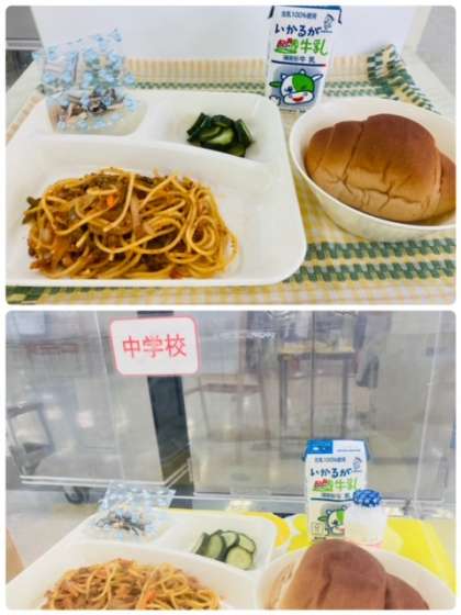 今日の献立は「スパゲッティミートソース、きゅうりのピクルス、アーモンドフィッシュ、中学校:発酵乳、1/2黒糖パン、牛乳」でした。