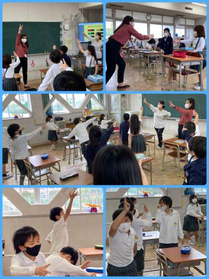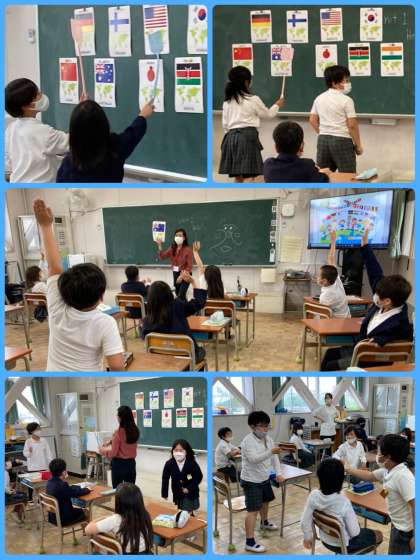 3年生は外国語活動の学習で、世界の国々の名前やあいさつなどを学びました。国旗を見て、アクセントに注意しながら国の名前が言えるように、一生懸命に覚えました。チーム対抗の国名クイズでは、とても盛り上がり、楽しく外国語活動にのぞむことができました。