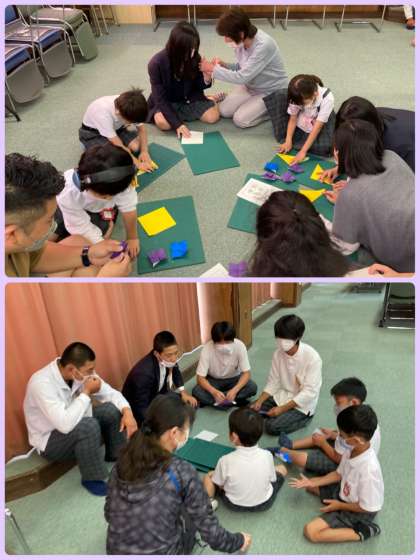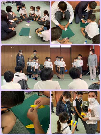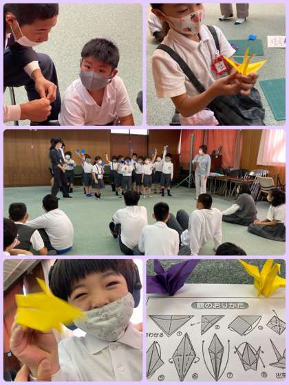 1年生は、9年生に折り鶴の作り方を教えてもらったお礼に、あじさいの作り方を伝えました。