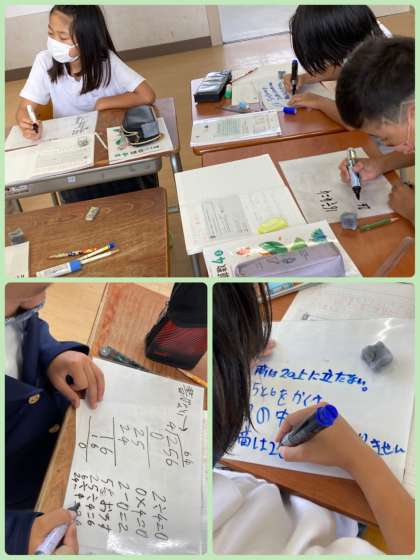 4年生は算数で、百の位の計算ができない3けた÷1けたのわり算の筆算の仕方を考えました。ミニホワイトボードに自分の考えを書いあと、班で共有しました。その後、全体で発表し、考察していきました。
