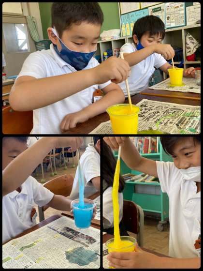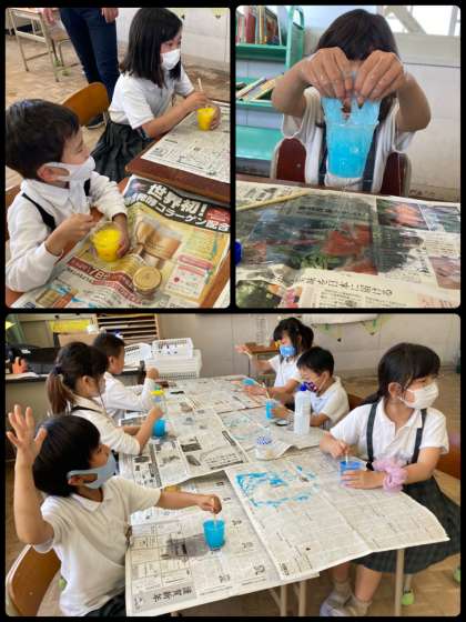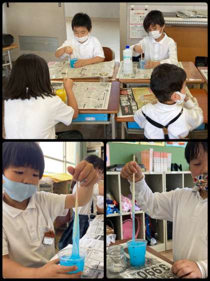 2年生は、不思議な感触がおもしろいスライムを作りました。洗濯のりとホウ砂水を混ぜ、自分の好きな色に仕上げました。うまく固まらない場面もありましたが、班で楽しく活動できました。
