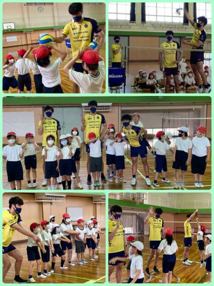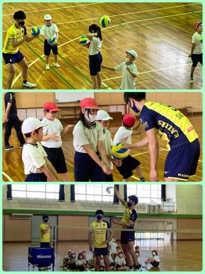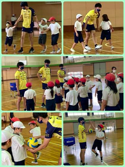 3年生は、おにごっこからスタートして、堺ブレイザーズの選手と一緒にバレーボールを楽しみました。うまくアンダーパスを返せた時は、笑顔でハイタッチしました。みんな少しずつ上達している様子でした。