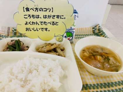今日の献立は「いわしてんぷら、五目汁、豚肉とさんどまめのいためもの、ごはん、牛乳」でした。