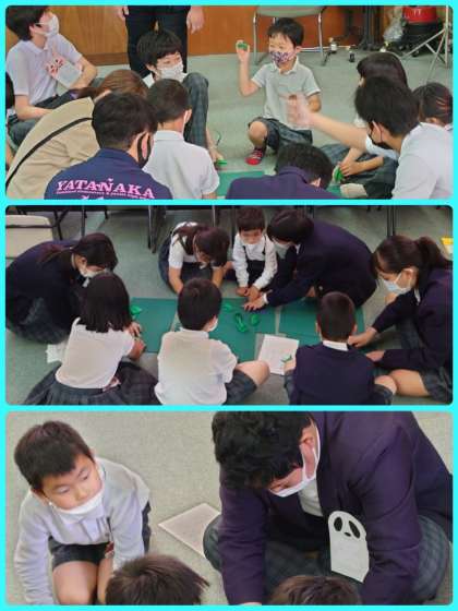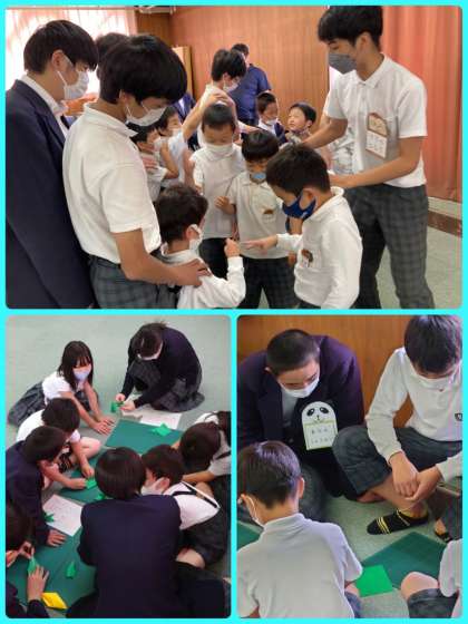 その後、折り紙で鶴をいっしょに折りました。折り方が分からない子には優しく教える姿があり、9年生として責任をもって活動できました。