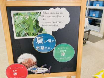 今日のオクラは、かつおぶし、梅肉、砂糖、米酢、うすくちしょうゆで味つけしていました。【かつおぶし】は、魚の加工食品で、赤のグループの食べ物です。