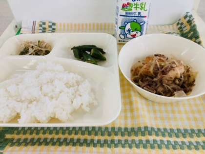 今日の献立は「すき焼き煮、オクラのかつお梅風味、もやしとピーマンのごまいため、ごはん、牛乳」でした。