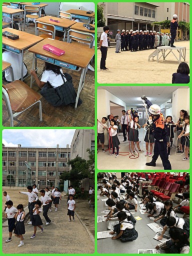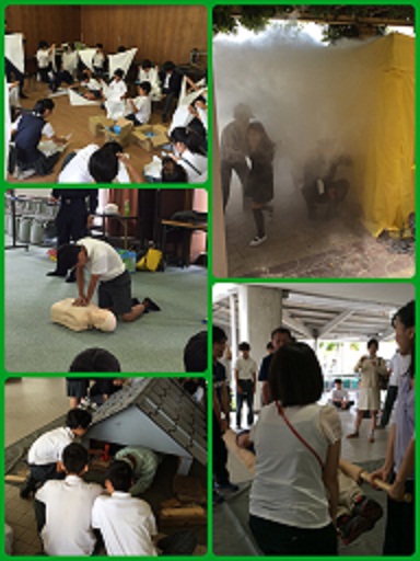 授業参観の後に続いて、地域防災訓練を行いました。地震を想定した避難訓練を行った後、消防署や地域の防災リーダーの方の指導のもと、学年ごとに体験型訓練を行いました。
