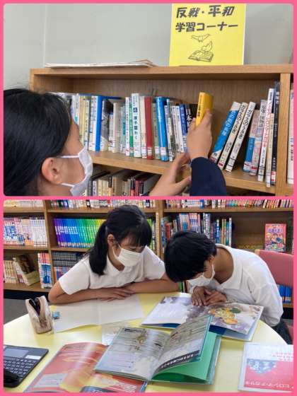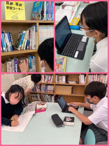 6年生は班に分かれて、テーマごとに図書室で調べ学習をしました。原爆について、広島と長崎について、生き残った人と亡くなった人についてなど、社会で学んでいる内容を発展させながら、平和学習を進めていきました。教科書だけでは分からなかったことも、たくさん知ることができました。