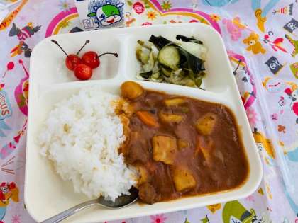 今日の献立は「ハヤシライス、ミックス海そうのサラダ、さくらんぼ、牛乳」でした。