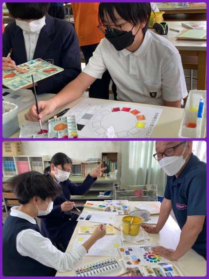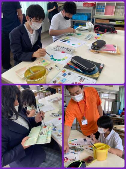 7年生は美術で、色の学習を進めました。色相環、明度、彩度の手順で、ムラのないように塗っていきました。丁寧に塗り進めており、準備から片付けまでてきぱきと動くことができました。