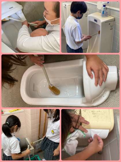 3年生は、今年度からトイレそうじの担当が始まりました。初めての場所なので、しっかりそうじの仕方を学んでからのぞんでいます。便器の奥の、見えない部分まできれいに磨いている子もいました。