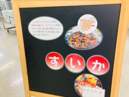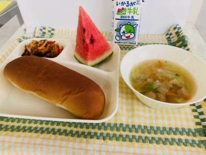 今日の献立は「パエリア、ウインナーとキャベツのスープ、すいか、黒糖パン、牛乳」でした。デザートは旬のすいかです。「大栄西瓜」が鳥取県から届き、