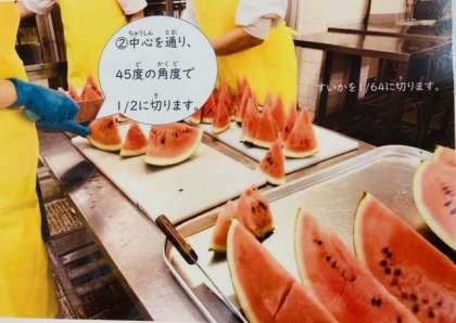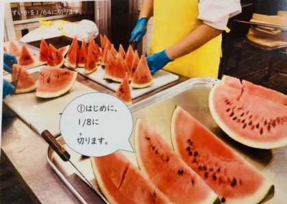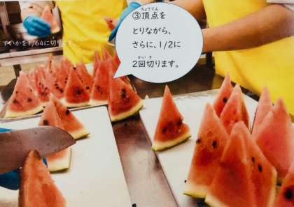 給食調理員さんが、丸いすいかを1/64に切ってくれました。