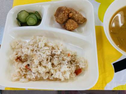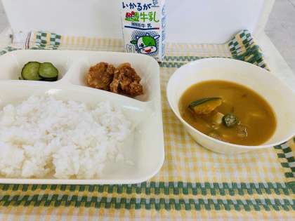 今日の献立は「豚肉のたつたあげ、みそ汁、きゅうりの甘酢づけ、ごはん、牛乳」中学校は「かやくご飯」でした。