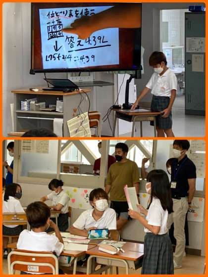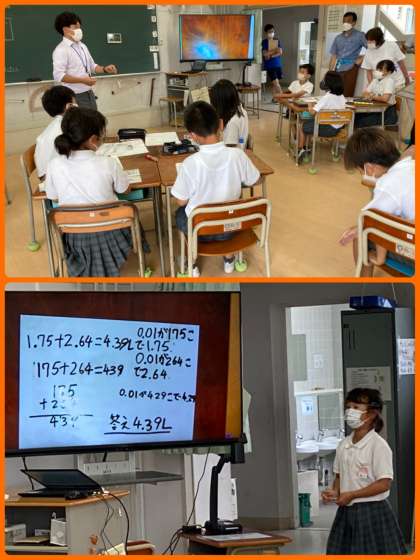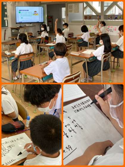 4年生は算数で、小数のたし算やひき算の学習をしています。個人用ホワイトボードに自分の考えを書き込み、班で交流しました。学級全体に向けて発表する時には、拡大して電子黒板に映し、それぞれの考え方を共有しました。