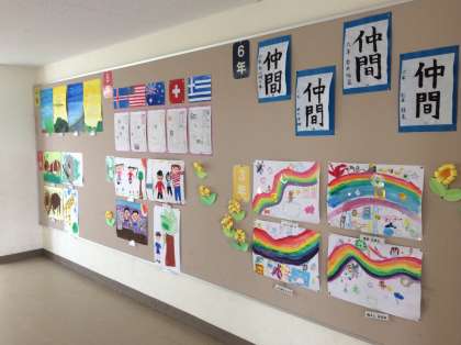 5年生は各国の国旗が描かれており、下にはその国のことを調べて新聞が掲示されていました。