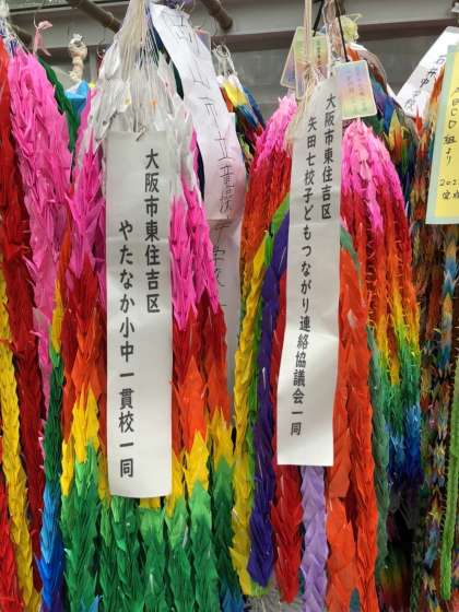 自分たちの未来を平和な世にすることを誓い、1年生から9年生、やたなか小中一貫校の児童生徒でつくった折り鶴を捧げました。