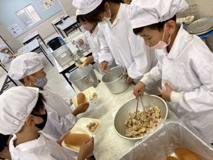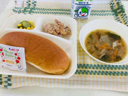 今日の献立は「鶏肉のからあげ、中華みそスープ、きゅうりとコーンの甘酢あえ、コッペパン、りんごジャム、牛乳」でした。