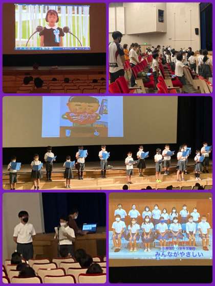 戦争の悲惨さを伝え、平和について考える機会を持つための平和集会が本日ありました。全校児童生徒が講堂に集まり、音楽部による島唄の演奏から始まりました。沖縄慰霊の日の平和の詩を視聴したあと、全員で黙とうをしました。3年生と6年生は全員が舞台に上がり、取り組んだことを発表して、全校児童生徒で平和への思いを共有することができました。