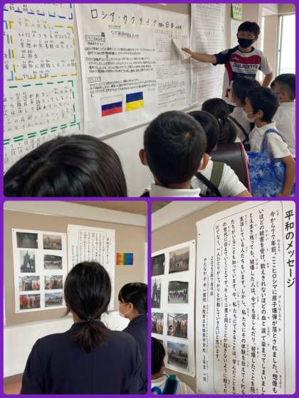 1学期の平和学習で取り組んだ成果を、学年ごとに講堂入口に掲示しました。小学校低学年は、担任の先生に解説してもらいながら、お兄さんお姉さんが学んだことを見てまわりました。