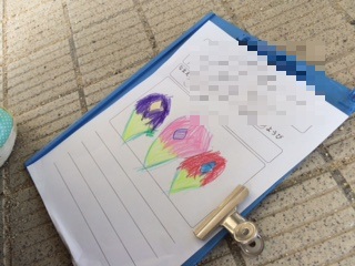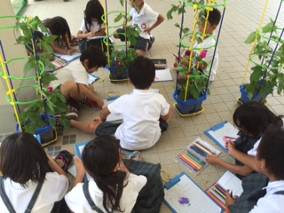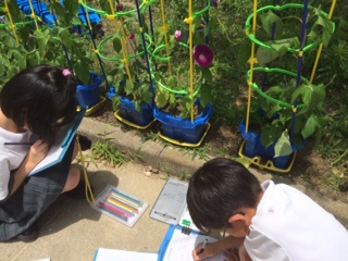 朝顔の色と同じ色の色鉛筆を選んで描いていました。