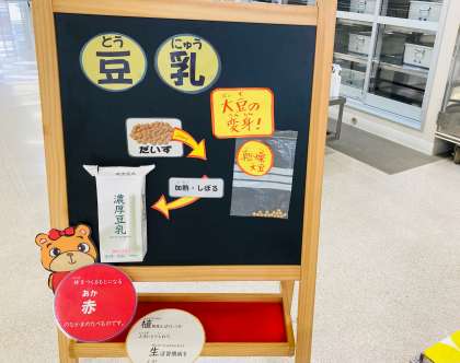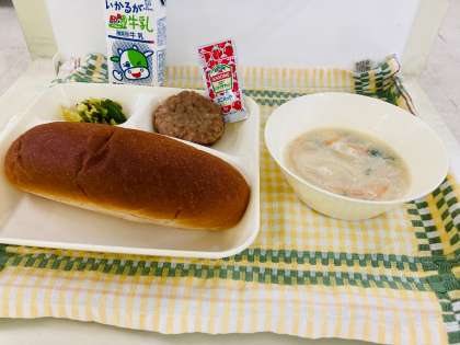 今日の献立は「焼きハンバーグ、豆乳スープ、キャベツとピーマンのカレーソテー、黒糖パン、牛乳」でした。豆乳の原材料は大豆です。大豆を水につけてからすりつぶし、加熱してしぼった汁が豆乳です。