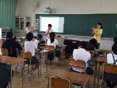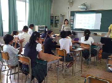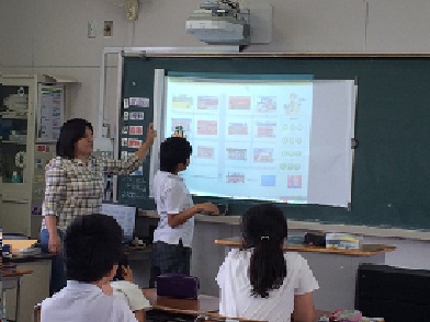 6年生の「外国語活動」の様子です。今日は、C−NETの先生を交えての学習の日です。電子黒板に写した地図を使って、『道案内』の学習をしました。英語での道案内にあわせて、キャラクターを動かしていきます。そして、最後に、到着した場所を英語で答えます。さあ、チャレンジです!上手にできたお友だちに、みんなで、拍手〜“good job."