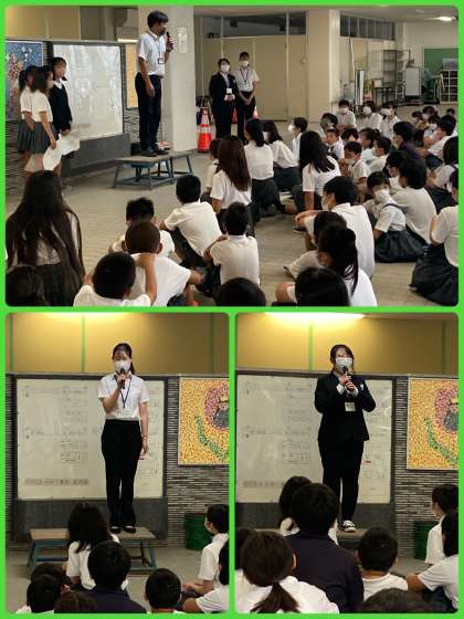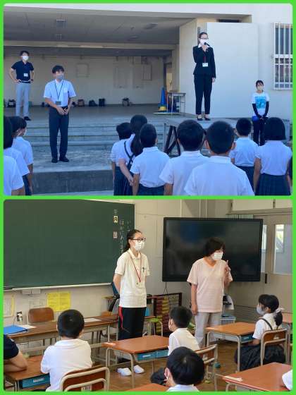 現在、小学校に教育実習生が3名来ています。講話を受けたり、各学級の授業を見て学んだり、子どもたちと遊んだりしながら学校生活を送っています。