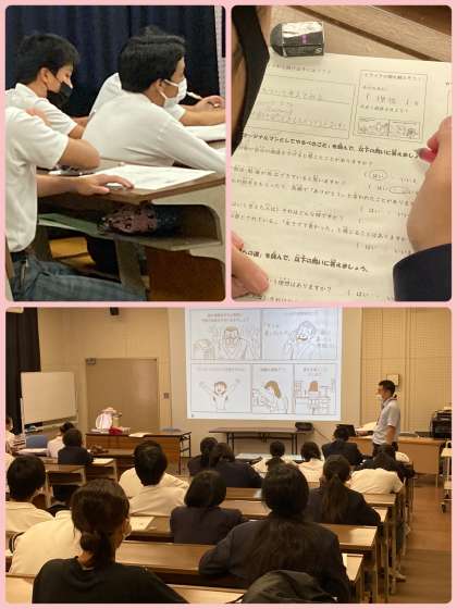 8年生は、思春期の自分の心の中にある不安な気持ちやしんどいことと向き合うことをねらいとして、自分自身の心の状態を客観的にみていきました。今の自分の欲求・理性・理想の割合を帯グラフで表し、矛盾が起こる原因を考えてみました。
