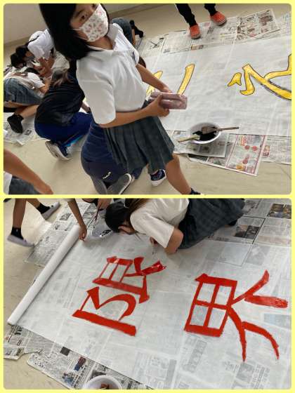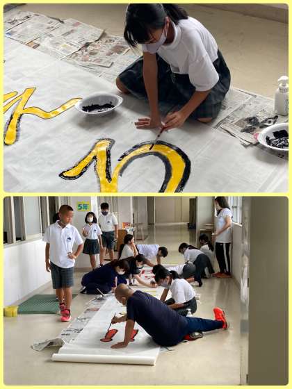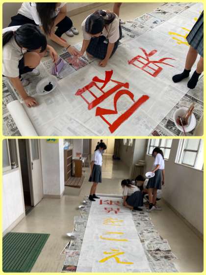 体育祭のスローガン「限界をこえろ!」の垂れ幕を作成中です。本番でのお披露目を楽しみにしておいてください。