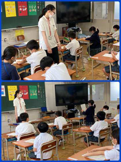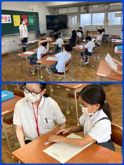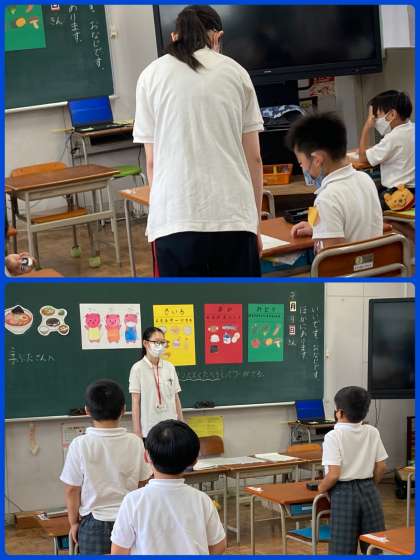 教育実習の先生に教えてもらい、たくさん発表している1年生の姿が見られました。