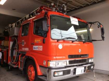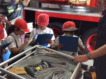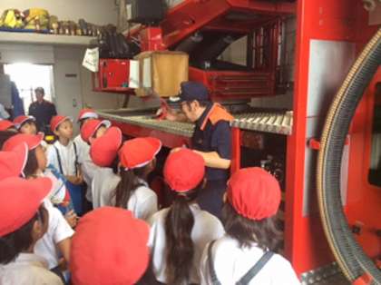 地域にある東住吉消防署矢田出張所へ社会見学に行きました。出張所には、はしご車とポンプ車の2台の消防車があり、その車の特徴や役割を説明してもらいました。はしごは30mまで伸びることや、ポンプ車には800Lの水が積まれていることなど、教えていただいたことをしっかりとメモに書き留めていました。消防署の中も見学し、様々な工夫があることを知りました。