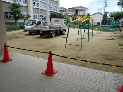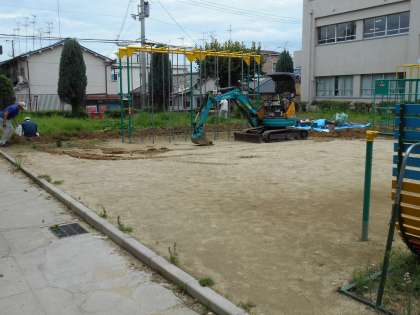 工事は約1週間で終わりますが、芝の養生期間が必要ですので9月中旬までは立入禁止になります。いきいきの活動場所は、その間は南側の中庭等を利用します。