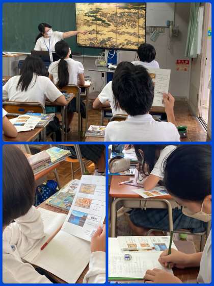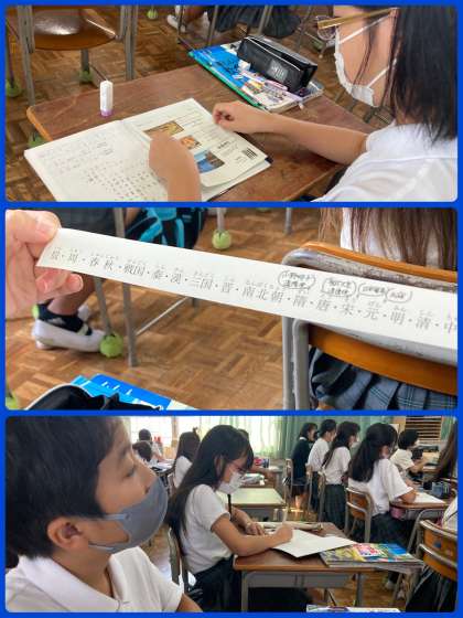 現在、6年生の社会は教育実習の先生が、しっかりと教材研究をして教えてくれています。流鏑馬(やぶさめ)や、笠懸(かさがけ)の場面を分かりやすくスライドで見せてくれたり、覚えやすいように中国の歴代の国名表を用意してくれたりと、児童の興味関心がわく授業を毎日考えてくれています。