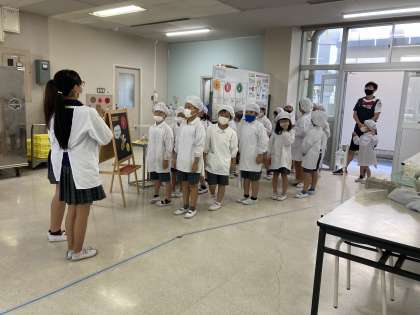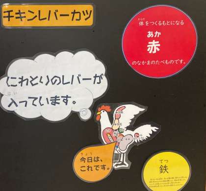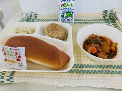 今日の献立は「チキンレバーカツ、ケチャップ煮、キャベツのバジル風味サラダ、コッペパン、りんごジャム、牛乳」でした。チキンレバーカツには鶏のレバーが使われています。カレー味にしているので、食べやすくなっています。