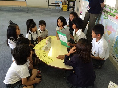 外国語活動の時間に、5年生と3年生の交流授業をしました。今日までに、5年生は、3年生のためにクイズを作ってきました。今日は、英語で「クイズ大会」です。