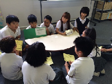 まずは、ウォーミングアップ。3年生と5年生がペアになって、「ABC」に歌に合わせて・・・。気持ちが温まったところで、5年生の代表から説明がありました。さあ、「クイズ大会」のスターです。各班とも工夫を凝らしてクイズを作ってきていました。出題する方も答える方もできるだけ英語を使ってがんばっていました。3年生難しい英語の時は、5年生が教えてくれていました。楽しそうに取り組んでいて、あっというまに時間が過ぎていきました。