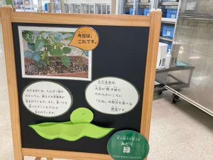 えだまめは、大豆が熟す前のやわらかい頃に「たね」の部分を食べる野菜です。育つと大豆になります。えだまめにも大豆と同じく、たんぱく質やカルシウム、鉄などが含まれています。また、夏バテ防止や疲労回復に効果のあるビタミンB1、ビタミンB2も含まれています。