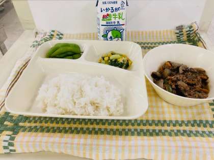 今日の献立は「マーボーなす、チンゲンサイとコーンのいためもの、えだまめ、ごはん、牛乳」でした。