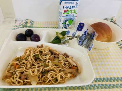 今日の献立は「焼きそば、オクラの甘酢あえ、ぶどう(巨峰)、1/2黒糖パン、牛乳」でした。