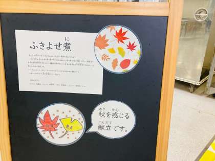 ふきよせ煮は、赤や黄色の落ち葉や木の実が木枯らしに吹き寄せられた様子を表した料理です。自然の風景を料理に取り入れて季節を表現するという日本の食文化を学校給食でも伝えたい、と取り入れられた献立です。