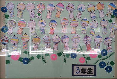 そんな7月にぴったりの掲示物を、3年生が作ってくれました。玄関を入ってすぐのピロティーの掲示板に、3年生が作った、たくさんの風鈴があります。