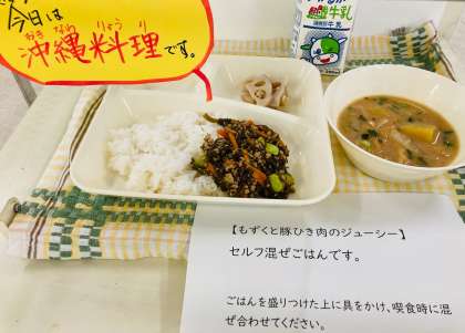今日の献立は「もずくと豚ひき肉のジューシー、さつまいものみそ汁、焼きれんこん、牛乳」でした。ジューシーは沖縄の家庭料理の一つです。豚肉ともずくやひじきなどの海そうを使った「沖縄風たきこみごはん」のことです。