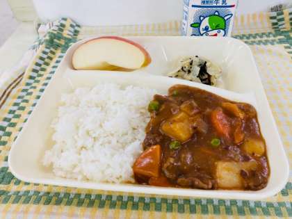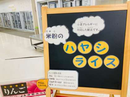 今日の献立は「ハヤシライス【米粉】、キャベツのひじきドレッシング、りんご、牛乳」でした。給食の定番ハヤシライスは、小麦粉から作るブラウンルウでとろみをつけています。今日は、小麦粉で作るブラウンルウのかわりに米粉(上新粉)を使っています。