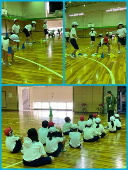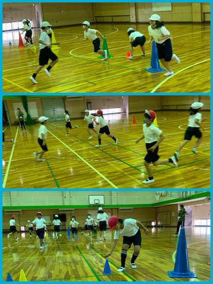3年生は体育で、コーン倒しゲームをしました。コーンを倒すチームと起こすチームに分かれて、どちらのコーンが多いか競いました。