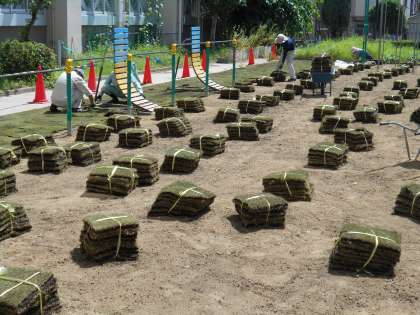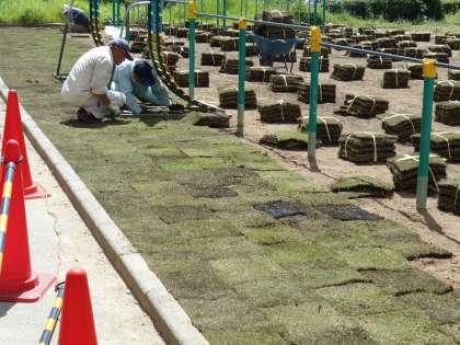 いよいよ今日から芝生の植え付け作業が始まりました。たくさんの芝生ブロックを一つ一つ丁寧に、はめ込んでいきます。完成が待ち遠しいですね。