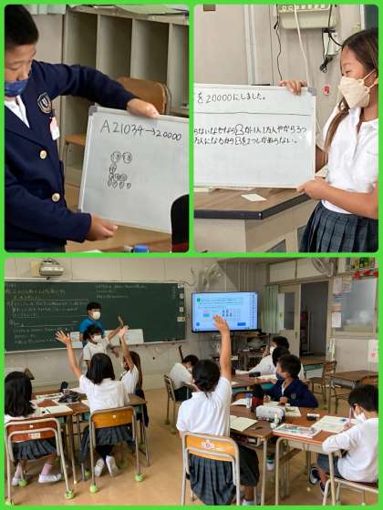 4年生は算数で、正確な数をおよその数にする方法を考えました。個人の考えをグループで共有し、ホワイトボードにまとめて発表しました。