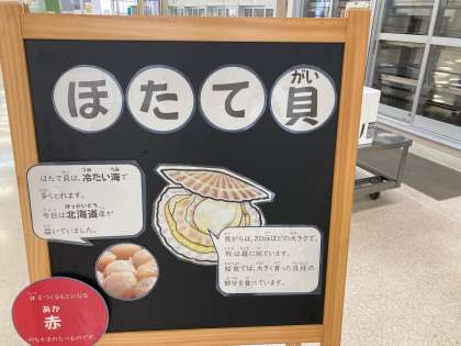ほたて貝には大きな貝柱があり、給食ではこの貝柱を使っています。貝柱には、うま味がたくさん含まれ、給食では、シチューやスープなどに使われています。